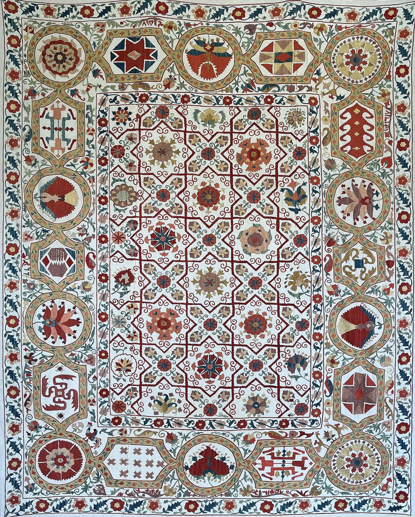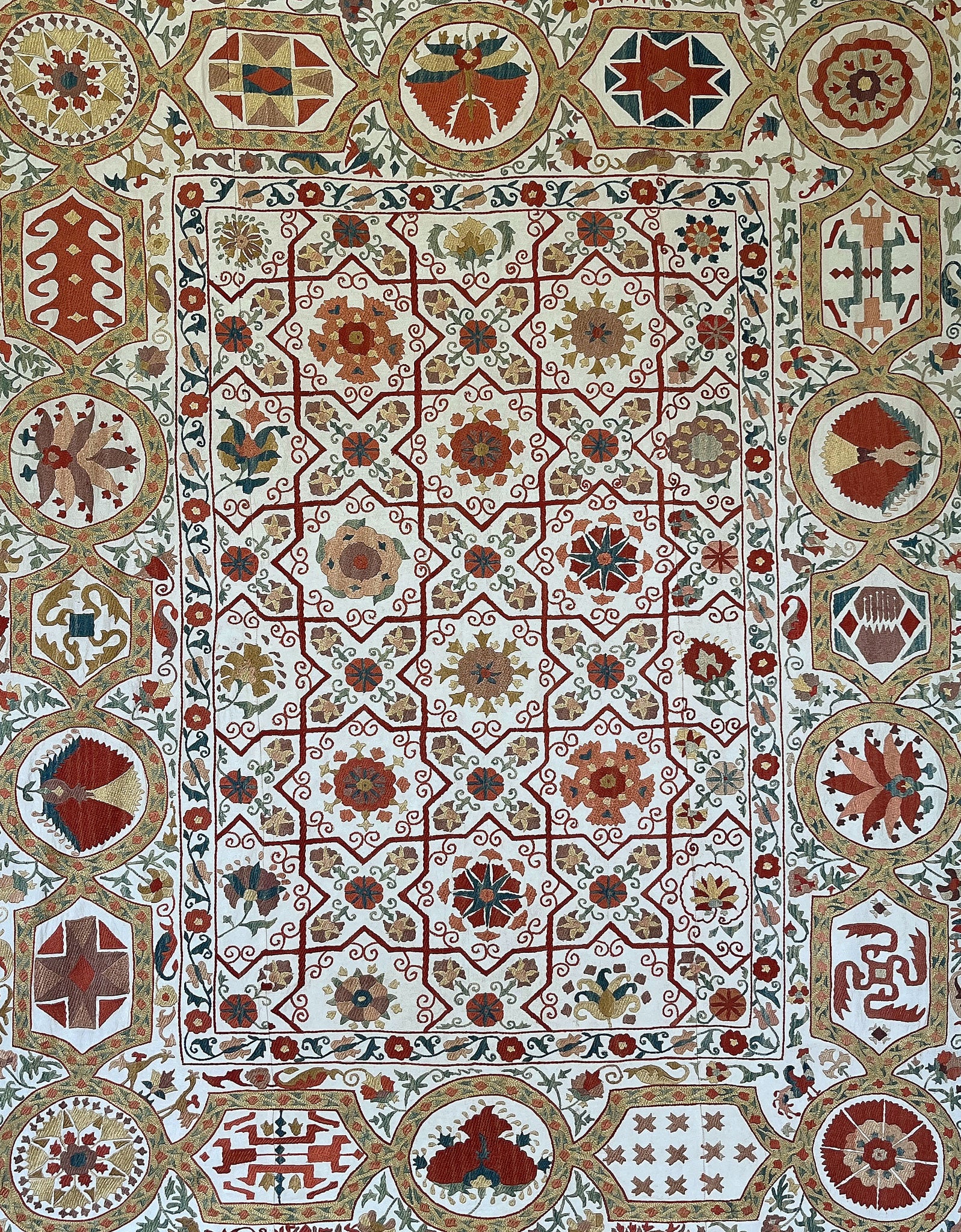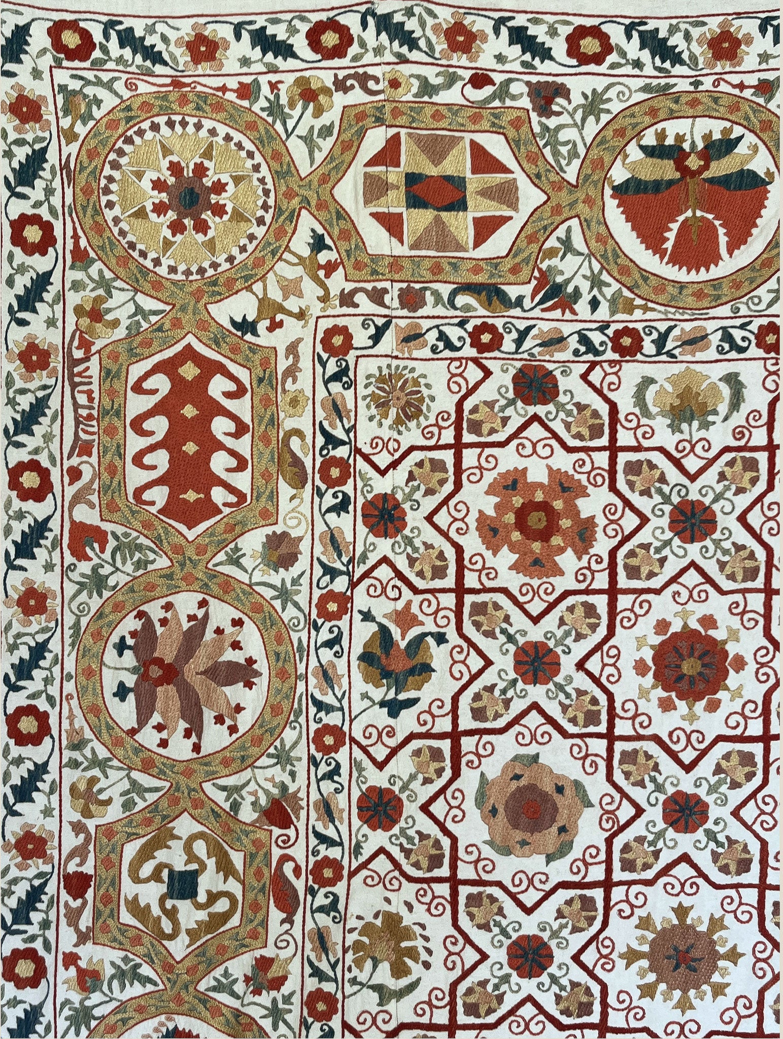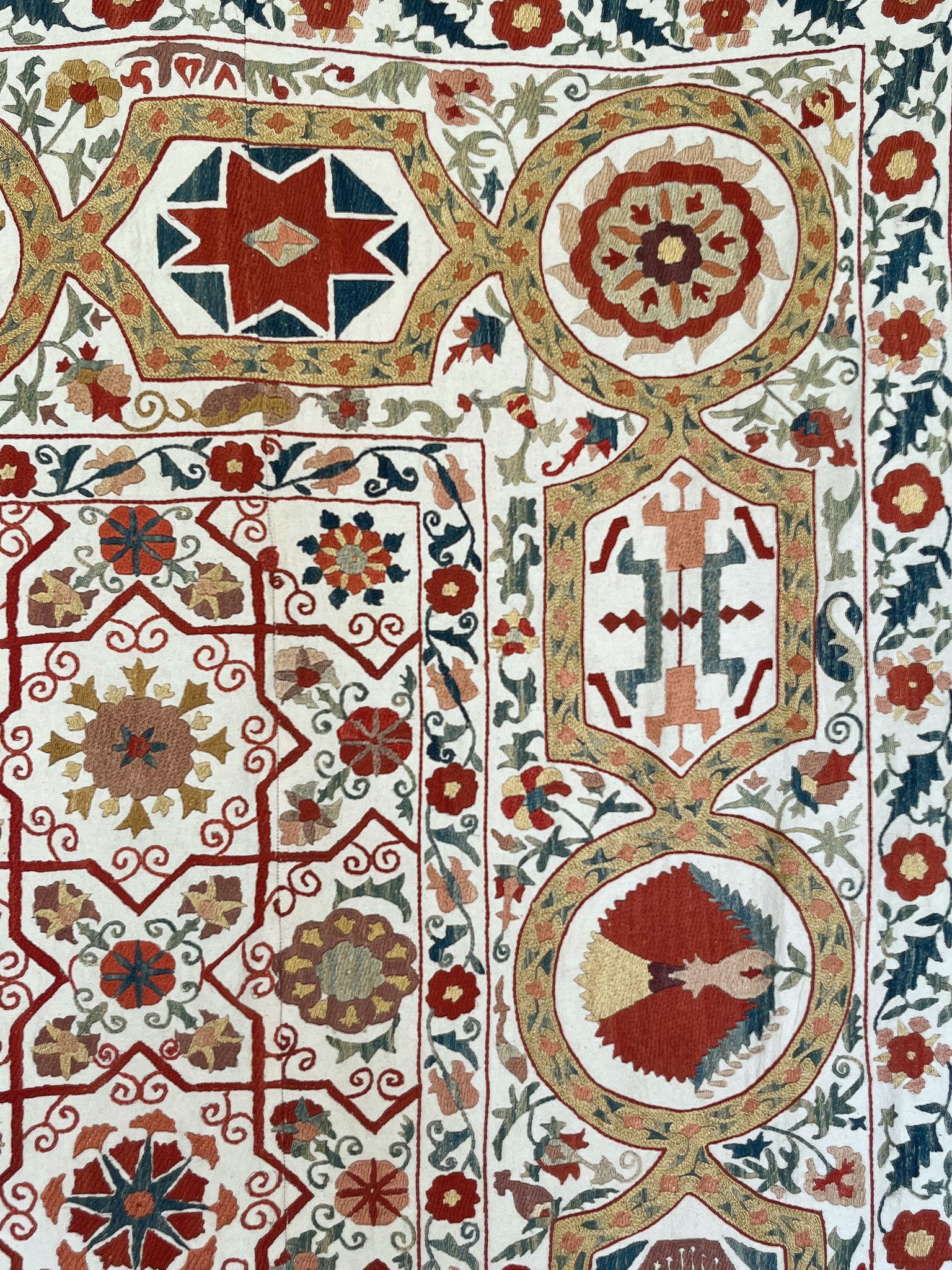 This one-of-a-kind wonder smoulders with the lived-in luxury of centuries old craftsmanship. Each Suzani panel features its own hand drawn story on cotton ground, punctuated by a thousand silky pinpricks. A timeless style hero that's exquisitely imperfect.